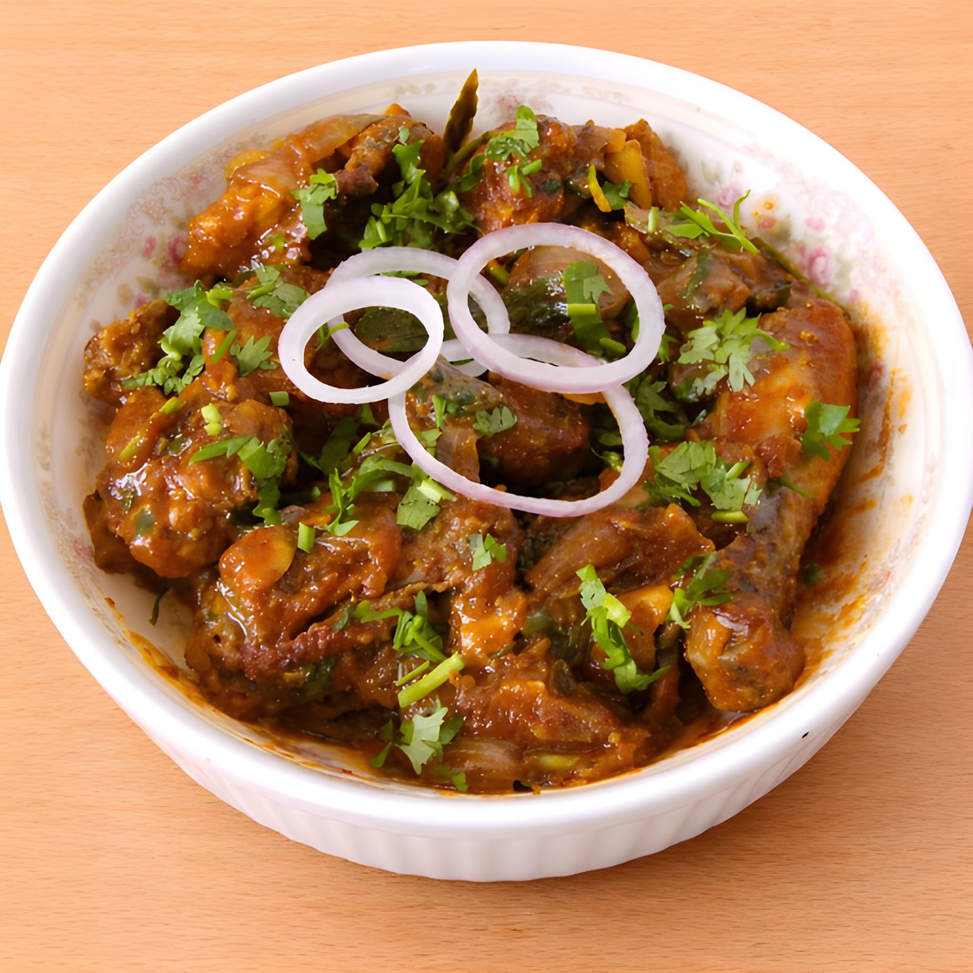 Spicy Hühnchen Masala ist ein aromatisches Hähnchengericht. Hähnchenstücke werden in einer würzigen Sauce aus Zwiebeln, Tomaten, Knoblauch, Ingwer und einer Mischung aus Gewürzen wie Garam Masala, Chili, Kurkuma und Koriander gekocht. Das Gericht ist kräftig, pikant und wird oft mit Reis, Naan oder Chapati serviert.