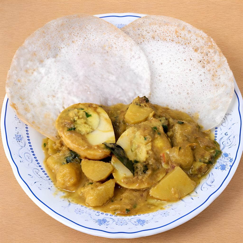 Appams are incomplete without this egg curry. The spicy-coconut-ty flavor of the curry blends well with the rice flour pancakes and the combination is simply amazing.