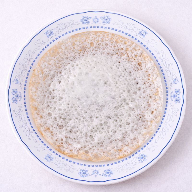 Once the mixture has fermented, heat an appamchatti. Pour one ladle of the batter and you can hear the sizzling sound, quickly swirl the pan in a clockwise direction. Cook on medium flame covered for around 2 minutes and check whether the sides of the appam have turned light golden brown. Appam is ready to be served.