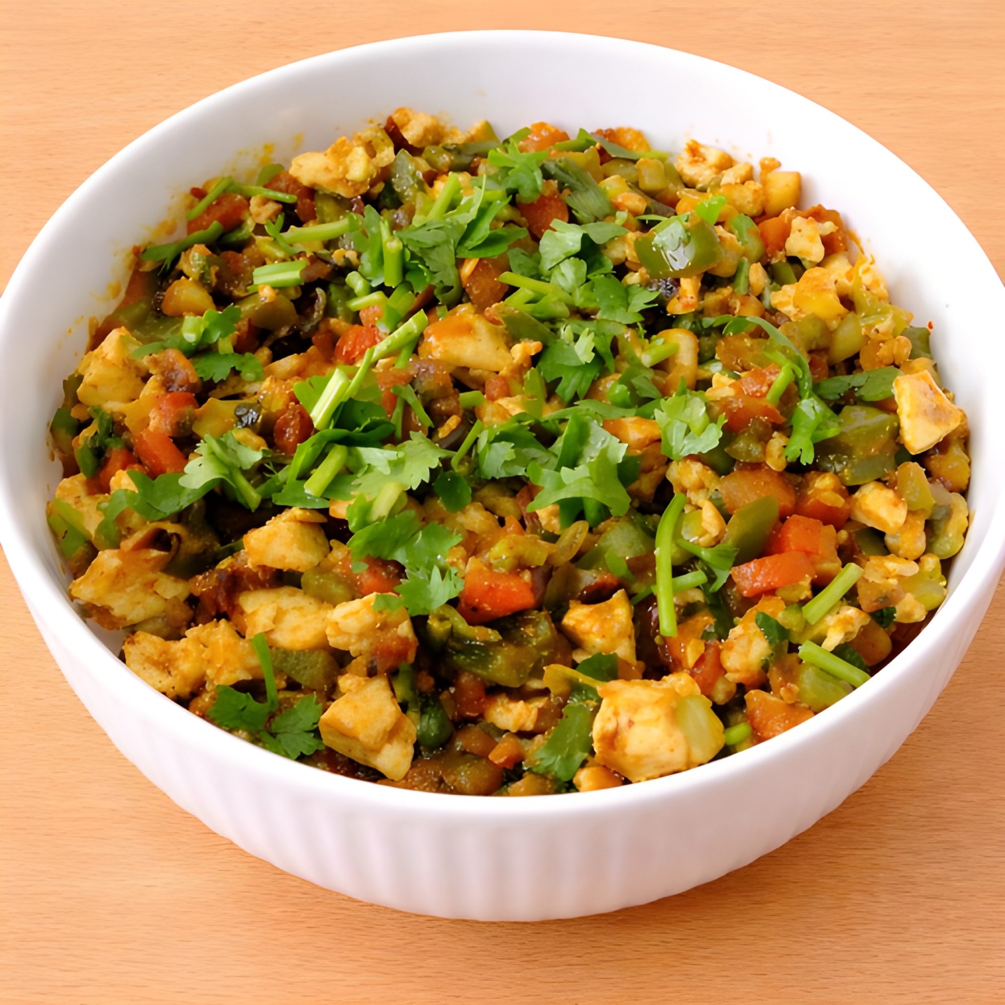 This is a vegetarian Indian dish that uses tofu as an egg substitute. The tofu is crumbled and fried together with onions, tomatoes, green chilies, and spices such as turmeric, cumin, and garam masala. It is similar to the North Indian dish “egg bhurjee” (scrambled eggs) and is often served with chapati, paratha, or toast.